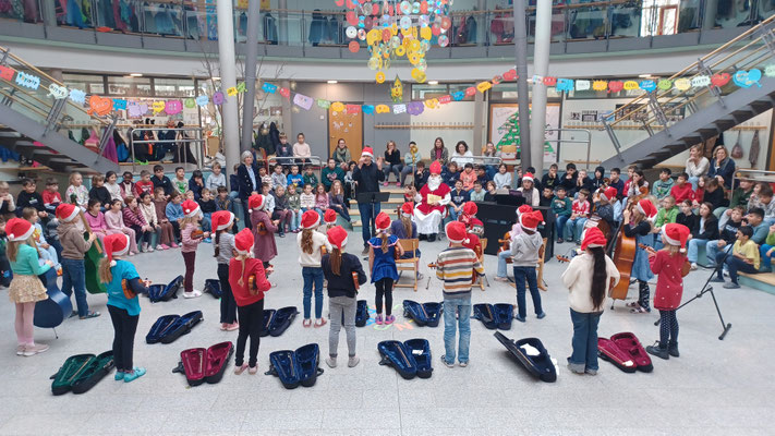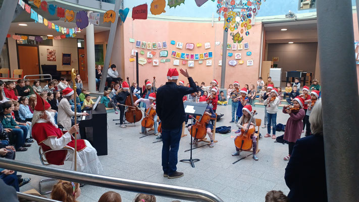 Im Anschluss daran trafen sich alle Schülerinnen und Schüler in der Aula, wo die Streicherklassen noch ein kleines „Konzert“ für den Nikolaus gaben und zeigen konnten, was sie seit September schon alles gelernt haben. Danach machte sich der Nikolaus wieder auf seinen langen Heimweg.