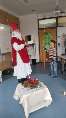 ...tönte es am Freitag den 5. Dezember wieder durch die Platanenschule. Alle Platanis freuten sich sehr, denn der Nikolaus kam wieder zu Besuch. In den einzelnen Klassen bescherte er dort jedes Kind mit einem kleinen Säckchen mit Nüssen, Schokolade, einem Apfel und einer Mandarine. Dabei lobte er alle Platanis sehr, ermahnte oder tadelte aber auch das ein oder andere Verhalten. Als Dank erhielt er von vielen Klassen Gedichte aufgesagt oder kleine Lieder gesungen!